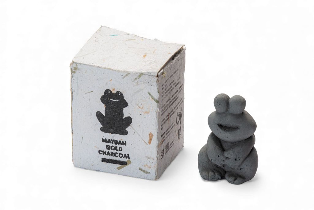 「麻園竹炭金」系列運用古坑麻園盛產的烏殼綠竹,以高溫裂解製成竹炭,並結合再生紙與環保材質,發展除臭竹炭、線香組與擴香石等生活風格品。作品呼應「循環 × 保育 × 在地 × 設計」理念,將農業廢材轉化為兼具功能與寓意的永續產品。以諸羅樹蛙等意象象徵生態守護,讓竹炭成為承載雲林山村文化與環境意識的日常物件。